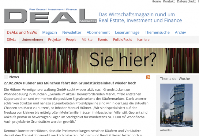 Aktuelle Pressemitteilung im DEAL-Magazin Die Hübner Vermögensverwaltung GmbH sucht wieder aktiv nach Grundstücken zur Wohnbebauung in München. „Gerade im aktuell herausfordernden Marktumfeld entstehen Opportunitäten und wir merken die positiven Signale seitens des Käufermarktes. Dank unserer schlanken Struktur und nahezu abgearbeiteten Projektpipeline sind wir in der Lage die aktuellen Chancen am Markt zu nutzen“, so Inhaber…