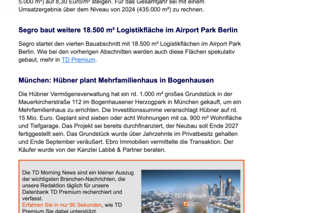 Aktuelle Pressemitteilung in den TD Morning News Die Hübner Vermögensverwaltung hat ein rd. 1.000 m² großes Grundstück in der Mauerkircherstraße 112 im Bogenhausener Herzogpark in München gekauft, um ein Mehrfamilienhaus zu errichten. Die Investitionssumme veranschlagt Hübner auf rd. 15 Mio. Euro. Geplant sind sieben oder acht Wohnungen mit ca. 900 m² Wohnfläche und Tiefgarage. Das…