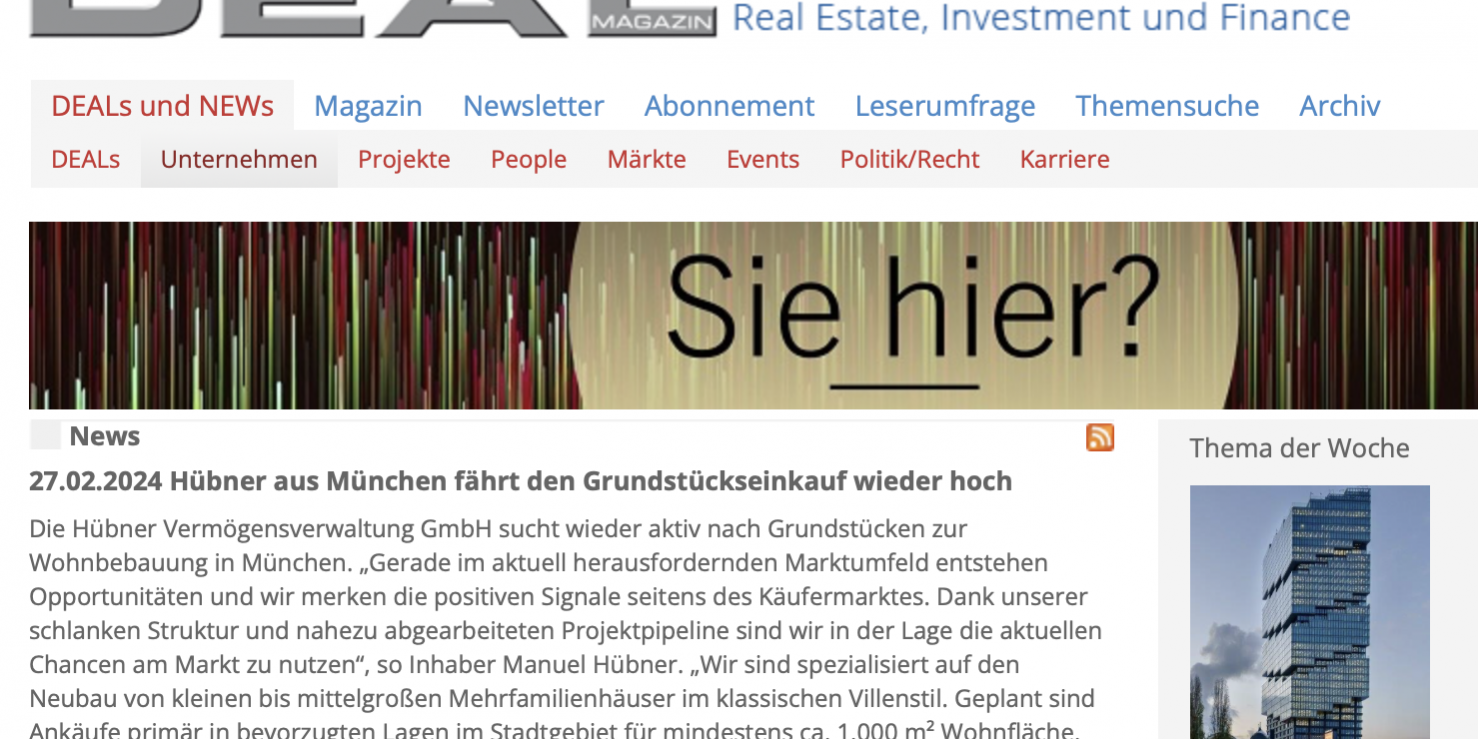 Die Hübner Vermögensverwaltung GmbH sucht wieder aktiv nach Grundstücken zur Wohnbebauung in München. „Gerade im aktuell herausfordernden Marktumfeld entstehen Opportunitäten und wir merken die positiven Signale seitens des Käufermarktes. Dank unserer schlanken Struktur und nahezu abgearbeiteten Projektpipeline sind wir in der Lage die aktuellen Chancen am Markt zu nutzen“, so Inhaber Manuel Hübner. „Wir sind spezialisiert auf den Neubau von kleinen bis mittelgroßen Mehrfamilienhäuser im klassischen Villenstil. Geplant sind Ankäufe primär in bevorzugten Lagen im Stadtgebiet für mindestens ca. 1.000 m² Wohnfläche. Auch projektierte Grundstücke werden geprüft.“